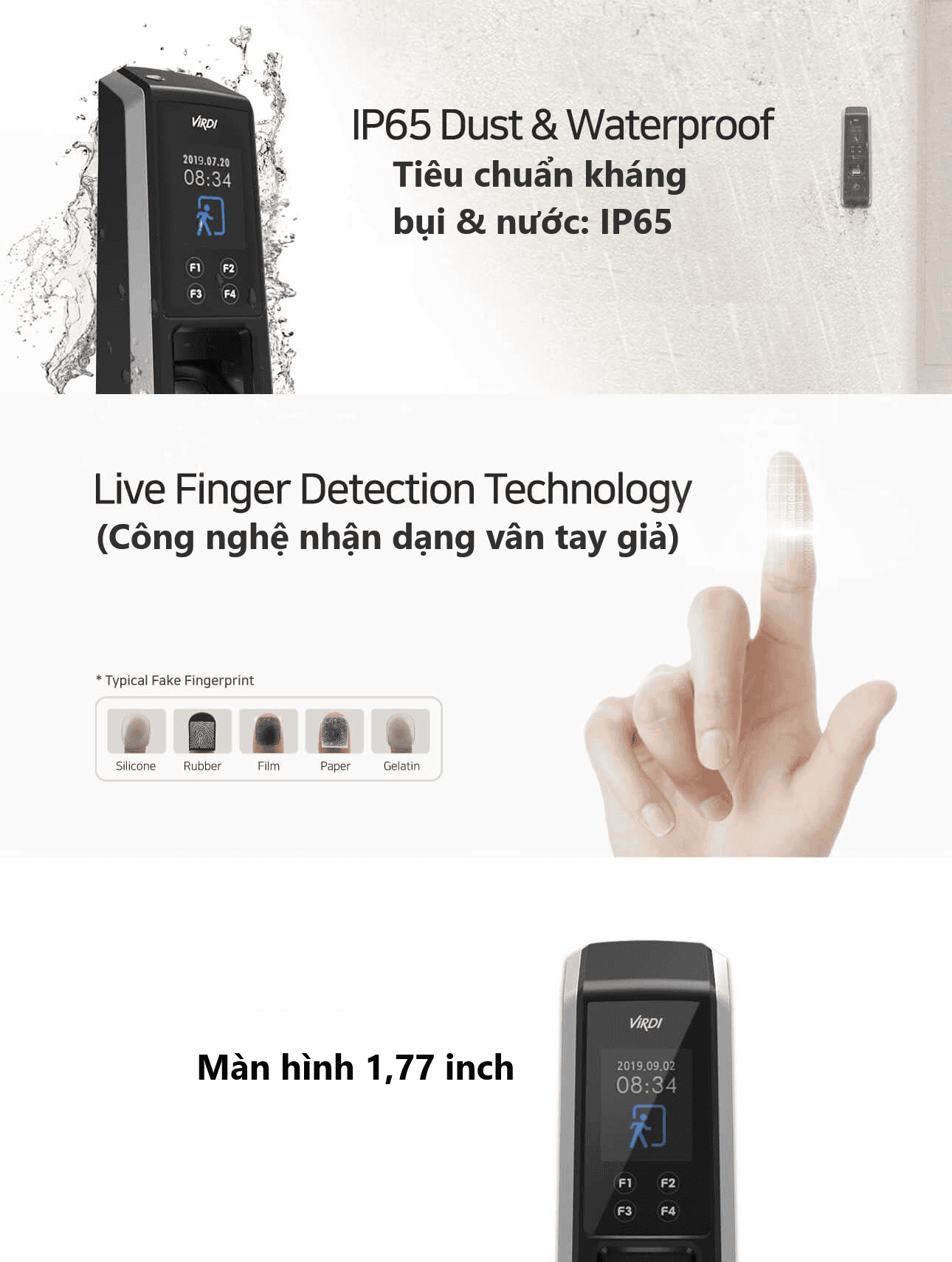 * Chức năng: chấm công - kiểm soát an ninh sử dụng đồng thời Vân tay & Thẻ.